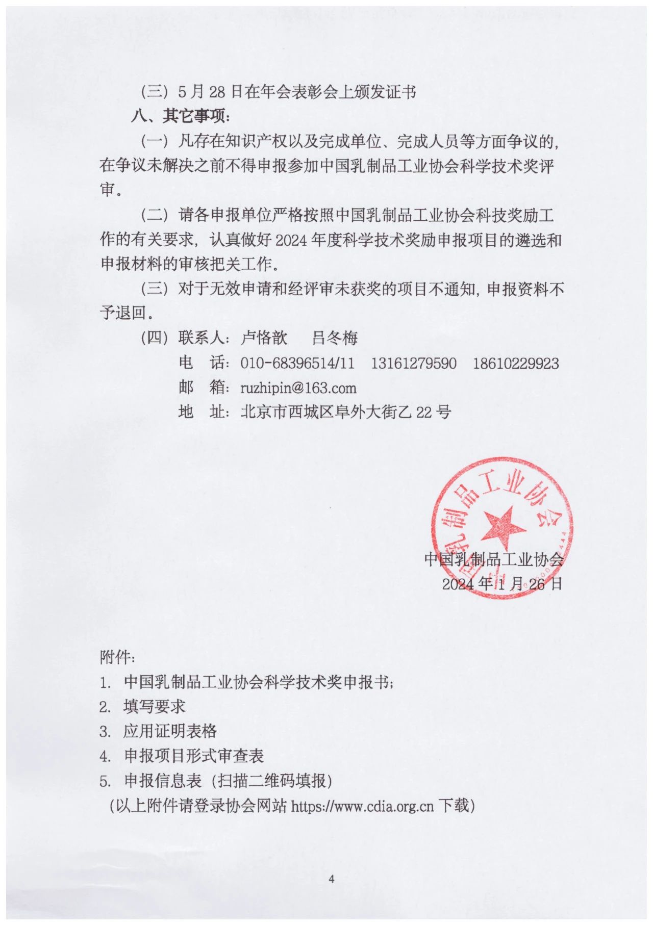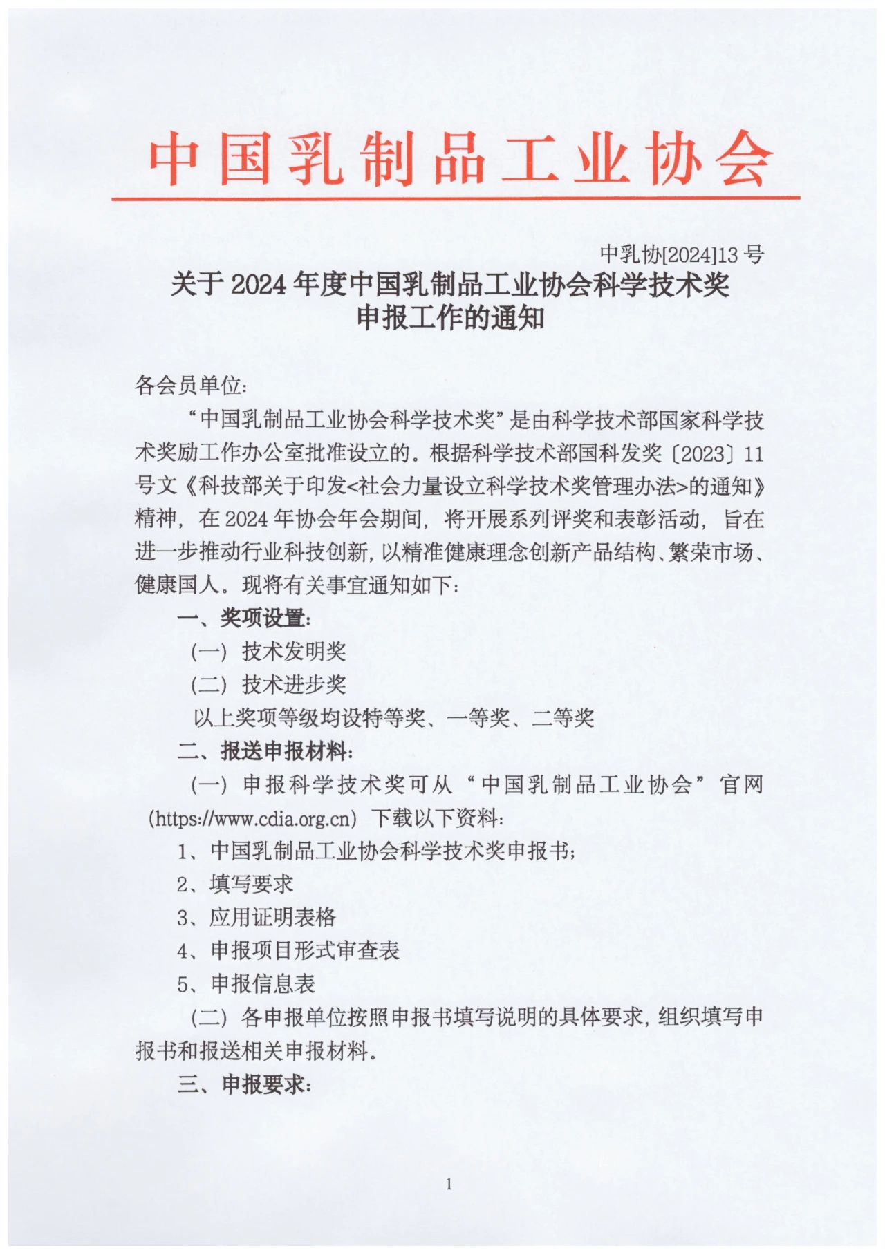 关于 2024 年度中国乳制品工业协会科学技术奖申报工作的通知